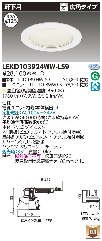 [法人限定] LEKD103924WW-LS9 東芝 ダウンライト 1000 ユニット交換形 軒下用 温白色 Φ125 [ LEKD103924WWLS9 ]