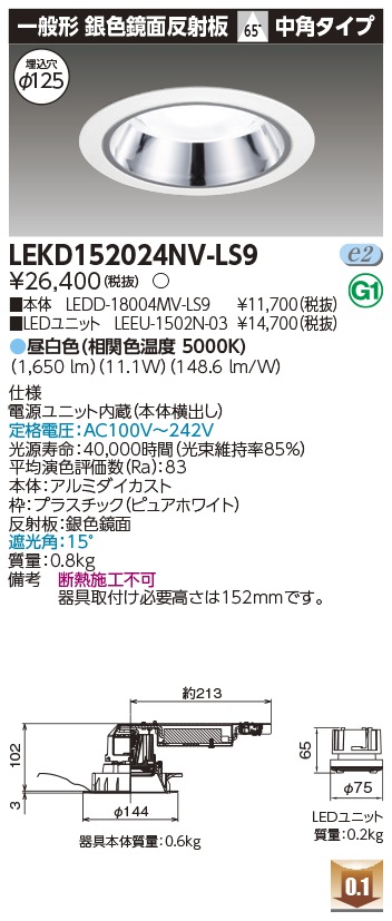 [法人限定] LEKD153024WV-LS9 東芝 ダウンライト 1500 ユニット交換形 銀色 鏡面 白色 Φ125 [ LEKD153024WVLS9 ]