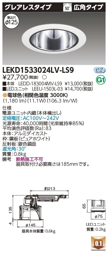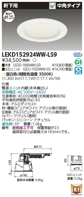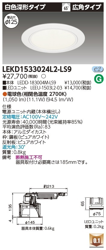 [法人限定] LEKD1523024WW-LS9 東芝 ※受注品 ダウンライト 1500 ユニット交換形 深形 温白色 Φ125 [ LEKD1523024WWLS9 ]