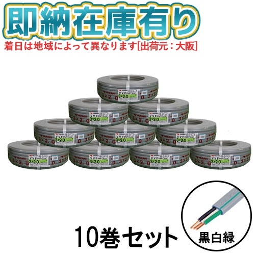●[法人限定][即納在庫有り] VVF3×2.0 10巻セット 矢崎電線 内線色(黒白緑) 10巻セット VVFケーブル 3芯 2.0mm 3心 3C 100m [ VVF3×2.0 10巻セット ]