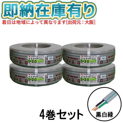 ●[法人限定][即納在庫有り] VVF3×2.0 4巻セット 矢崎電線 内線色(黒白緑) 4巻セット VVFケーブル 3芯 2.0mm 3心 3C 100m [ VVF3×2.0 4巻セット ]