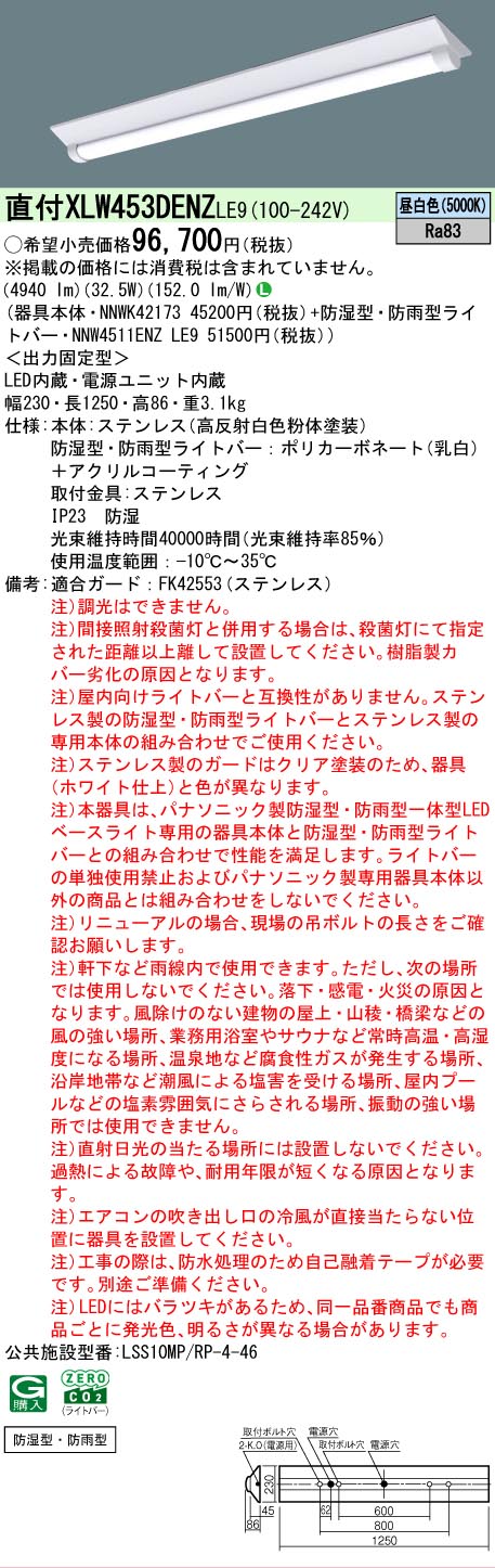 [法人限定][即納在庫有り] XLW453DENZ LE9 パナソニック LEDベースライト 昼白色 直付型 40形ステンレス製 防湿・防雨 Dスタイル/富士型 [ XLW453DENZLE9 ]