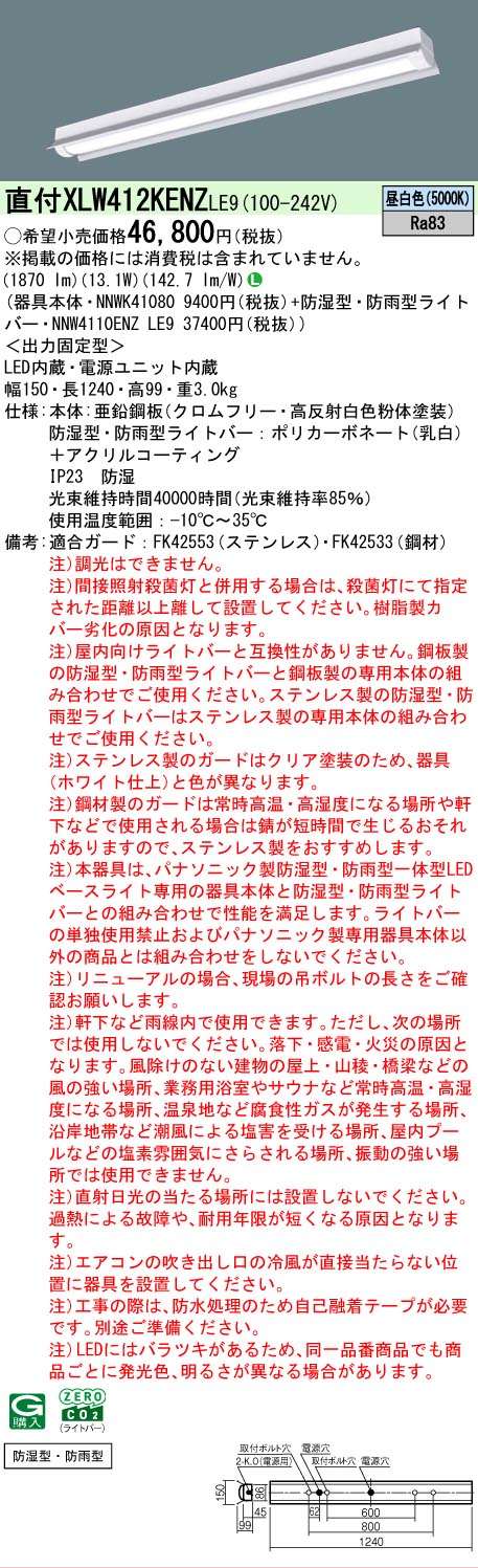 [法人限定][取寄品] XLW412KENZ LE9 パナソニックLEDベースライト 防湿・防雨 40形直付型笠付タイプ 昼白色 [ XLW412KENZLE9 ]