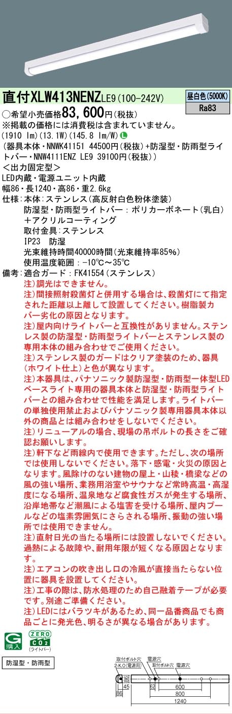 [法人限定][即納在庫有り] XLW413NENZ LE9 パナソニック LEDベースライト 昼白色 直付型 40形ステンレス製 防湿・防雨 iスタイル/笠なし型 [ XLW413NENZLE9 ]