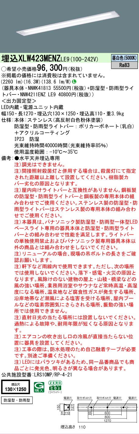 [法人限定][即納在庫有り] XLW423MENZ LE9 パナソニック LEDベースライト 昼白色 埋込型 40形ステンレス製 防湿・防雨 下面開放型 [ XLW423MENZLE9 ]