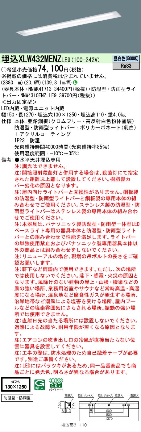 [法人限定][即納在庫有り] XLW432MENZ LE9 パナソニックLEDベースライト(用途別) 防湿・防雨 40形埋込型下面開放タイプW130 昼白色 [ XLW432MENZLE9 ]