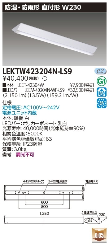 [法人限定][即納在庫有り] LEKTW423204N-LS9 東芝LEDベースライト 直付40形W230 防湿・防雨 [ LEKTW423204NLS9 ]