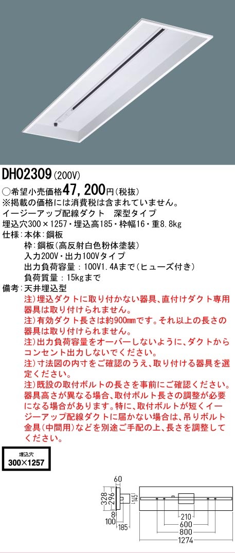 寸法・質量 ◆埋込穴幅:300 mm ◆埋込穴長:1257 mm ◆埋込高:185 mm ◆質量:8.8 kg 仕様・注意事項 使用に関しての留意点 ◆電圧:200 V ◆【本体】亜鉛鋼板 ◆【枠】鋼板(高反射白色粉体塗装) ◆入力200V・出力100Vタイプ ◆出力負荷容量:100V1.4Aまで(ヒューズ付き) ◆負荷質量:15kgまで ◆天井埋込型、深型タイプ ◆天井埋込型 ◆注)埋込ダクトに取り付かない器具、直付けダクト専用器具は取り付けられません。 ◆注)有効ダクト長さは約900mmです。それ以上の長さの器具は取り付けられません。 ◆注)出力負荷容量をオーバーしないように、ダクトからコンセント出力しないでください。 ◆注)寸法図の内寸をご確認のうえ、取り付ける器具を選定ください。 ◆注)既設の取付ボルトの長さを事前にご確認ください。器具高さが異なる場合、取付ボルト長さの調整が必要になる場合があります。特に、取付ボルトが短くイージーアップ配線ダクトに届かない場合は、吊りボルト金具(中間用)などを別途ご手配の上、長さを調整してください。
