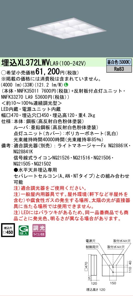[法人限定][即納在庫有り] XL372LWV LA9 パナソニック 天井埋込型 LED マルチコンフォート15 連続調光型調光タイプ ライコン別売 スクエア 昼白色 [XL372LWVLA9]