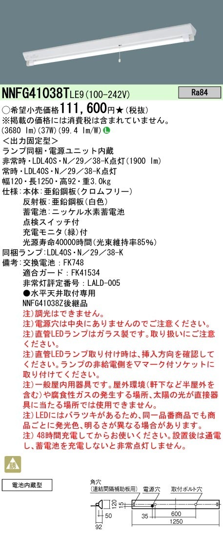 [法人限定][即納在庫有り] NNFG41038T LE9 パナソニック 天井直付型 40形 非常用 富士型器具 3800lm相当 LDL40S・N/29/38-K 1本付 [ NNFG41038TLE9 ]