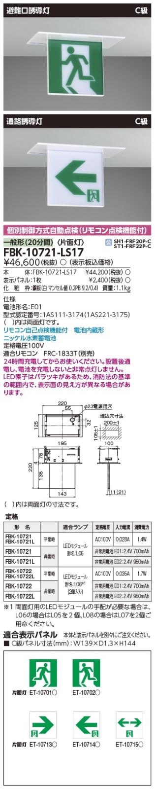 [法人限定][即納在庫有り]FBK-10721-LS17 東芝 C級天井 埋込 片面 誘導灯 ※表示板別売 [ FBK10721LS17 ]
