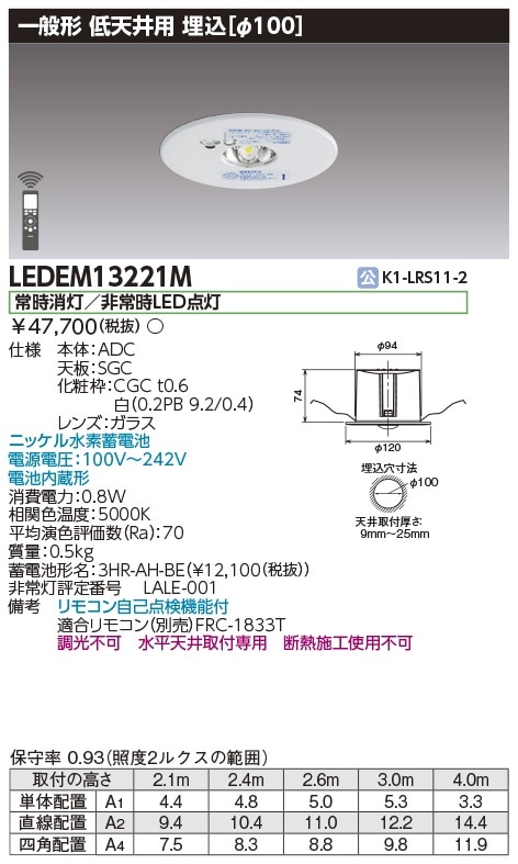 [法人限定][即納在庫有り]LEDEM13221M 東芝 低天井用 埋込 LED 非常灯 専用形 [ LEDEM13221M ]