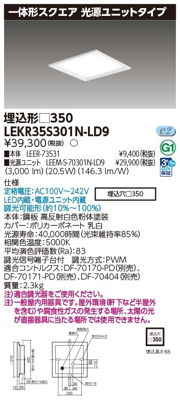 ○[法人限定][即納在庫有り] LEKR35S301N-LD9 東芝 TENQOO スクエア 埋込 □350 昼白色 [ LEKR35S301NLD9 ]