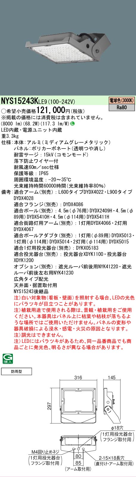 [法人限定][即納在庫有り] NYS15243K LE9 パナソニック LED投光器 天井直付型 据置取付型 電球色 広角タイプ配光 防雨型 防噴流型 耐塵型 [ NYS15243KLE9 ]