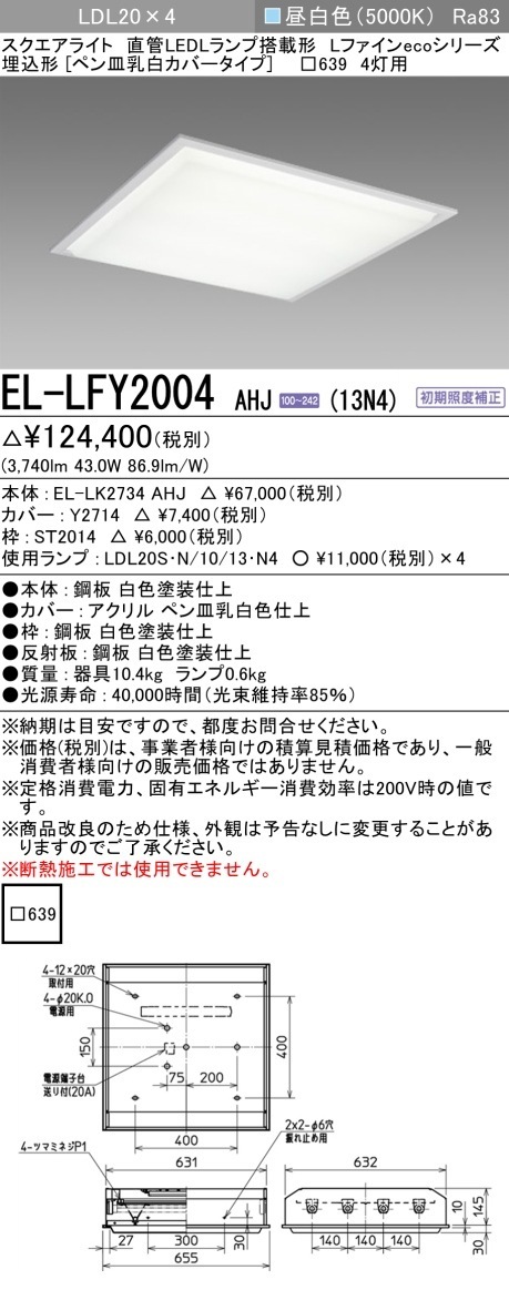 ▲納期未定[法人限定] EL-LFY2004 AHJ(13N4) 三菱 ※受注品 Lファインecoシリーズ ※ランプ付き スクエア LDL20 埋込 ペン皿乳白カバー □639 昼白色 4灯用 [ ELLFY2004AHJ13N4 ]