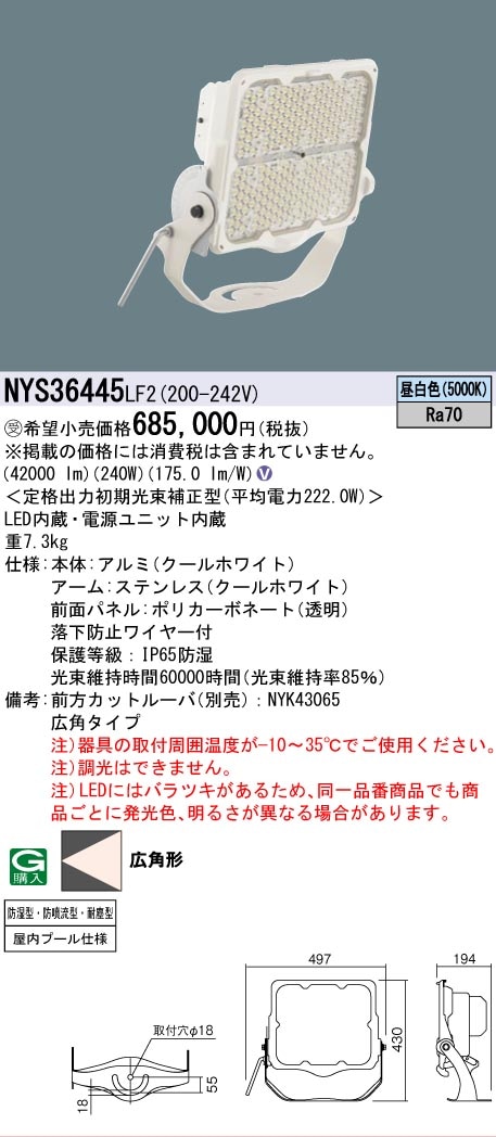 [法人限定][取寄品] NYS36445 LF2 パナソニック ※受注品 LED投光器プールビームER 広角 昼白色 [ NYS36445LF2 ] 旧品番: NNY24741K LA2 (NNY24741KLA2)