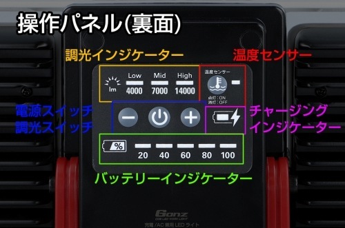 ・温度センサー:温度センサーがONの時、本体温度を感知し、自動で光量を下げることで本体が熱くなりすぎることを防ぐ。