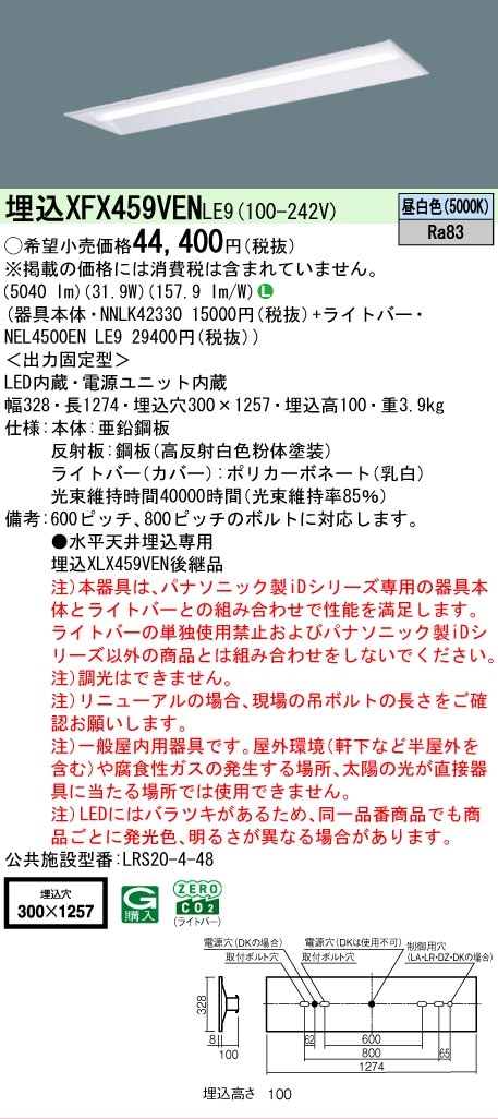◆全光束:5040 lm ◆安定器出力型:定格出力型 ◆安定器補足:<出力固定型> ◆電圧:100~242 V ◆消費電力:31.9 W ◆消費効率:157.9 lm/W ◆【本体】亜鉛鋼板 ◆【反射板】鋼板(高反射白色粉体塗装) ◆【ライトバー(カバー)】ポリカーボネート(乳白) ◆Ra83 ◆600ピッチ、800ピッチのボルトに対応します。 ◆●水平天井埋込専用 ◆注)本器具は、パナソニック製iDシリーズ専用の器具本体とライトバーとの組み合わせで性能を満足します。ライトバーの単独使用禁止およびパナソニック製iDシリーズ以外の商品とは組み合わせをしないでください。 ◆注)調光はできません。 ◆注)リニューアルの場合、現場の吊ボルトの長さをご確認お願いします。 ◆注)一般屋内用器具です。屋外環境(軒下など半屋外を含む)や腐食性ガスの発生する場所、太陽の光が直接器具に当たる場所では使用できません。 ◆注)LEDにはバラツキがあるため、同一品番商品でも商品ごとに発光色、明るさが異なる場合があります。 ◆幅:328 mm ◆長:1274 mm ◆埋込穴幅:300 mm ◆埋込穴長:1257 mm ◆埋込高:100 mm◆質量:3.9 kg◆LED(昼白色) ◆色温度:5000 K ◆光束維持時間40000時間(光束維持率85%) ◆LED(昼白色) ◆色温度:5000 K ◆光束維持時間40000時間(光束維持率85%) LED内蔵電源ユニット内蔵