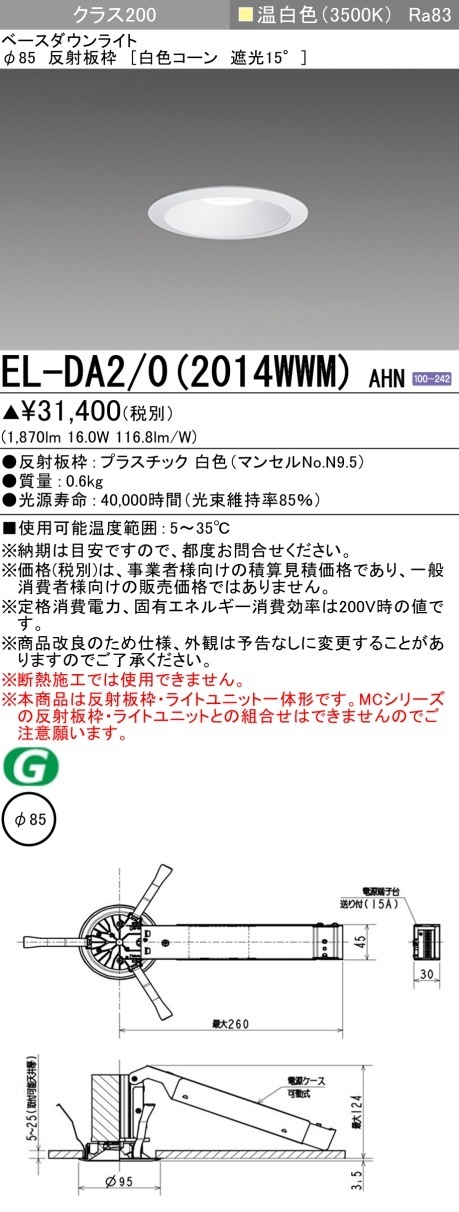 ▲納期未定[法人限定][取寄品] EL-DA2/0(2014WWM) AHN 三菱 ※受注品 ダウンライト Φ85 温白色 [ ELDA202014WWMAHN ]