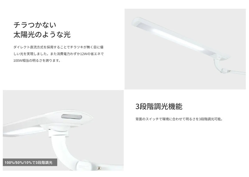 クランプタイプ・タッチスイッチ・3段階調光(強12W 中6W 弱1.3W)
