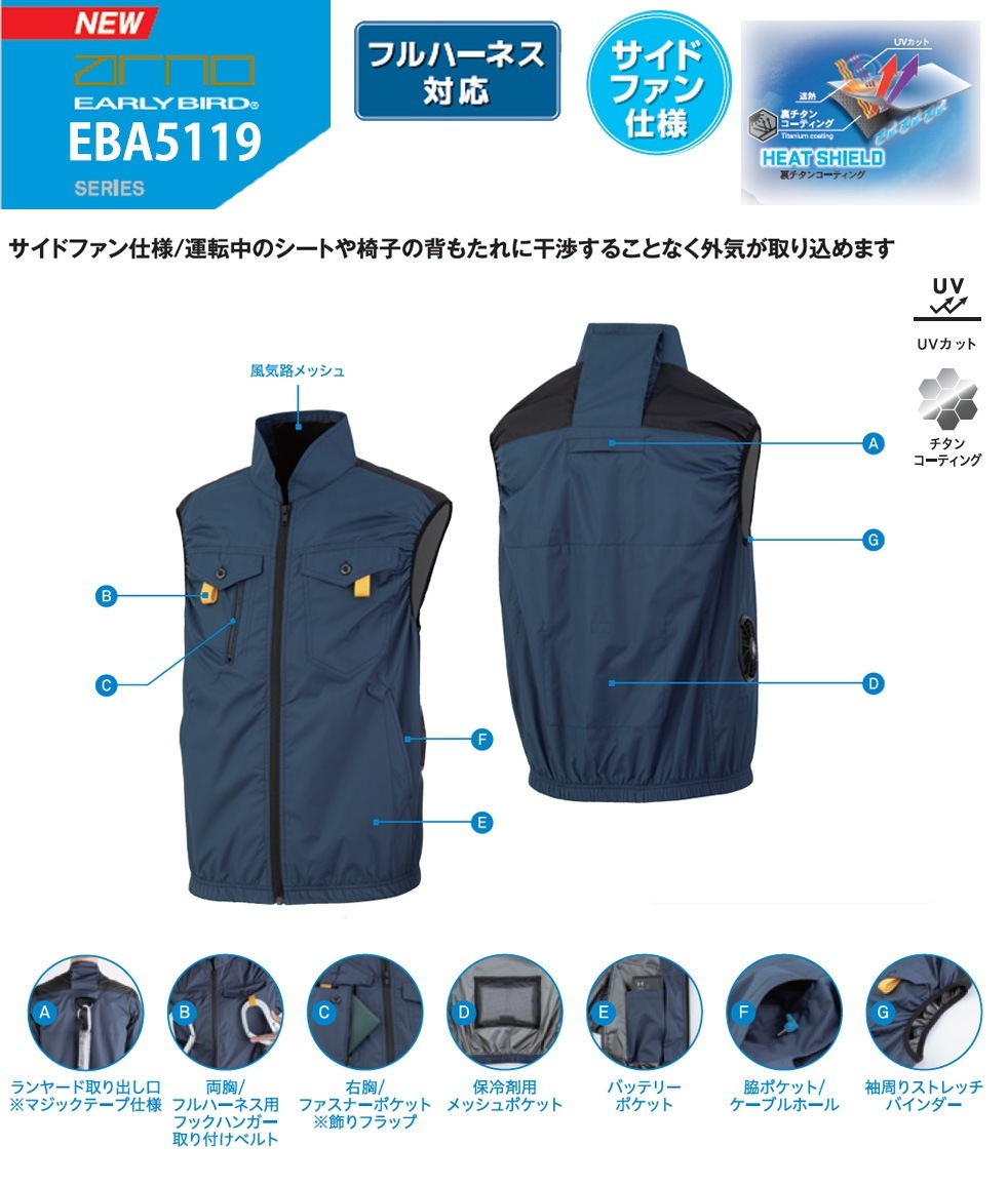○[即納在庫有り] 空調風神服 EBA5119-56 EARLYBIRD ARNO ネイビー×ブラック サイズ M ネイビー×ブラック ベスト サイドファン仕様 作業着 熱中症対策 フルハーネス対応 サイドファン 服単品 バッテリー・ファン別売り bigborn ビッグボーン [ EBA511956 ]