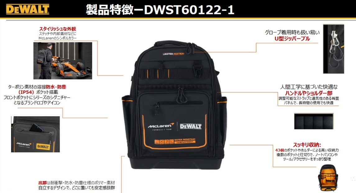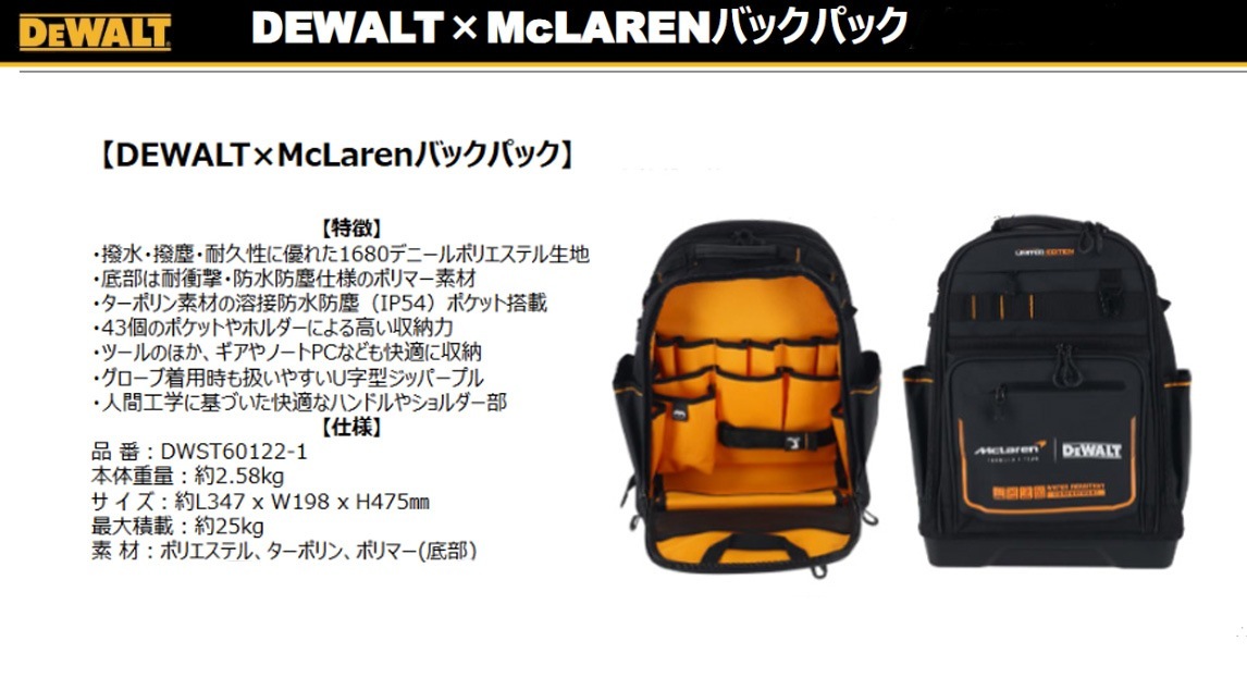 ○[即納在庫有り] DWST60122-1 デウォルト 数量限定 DEWALT×McLarenバックパック 防水 防塵 工具 リュック ツールバッグ [ DWST601221 ]