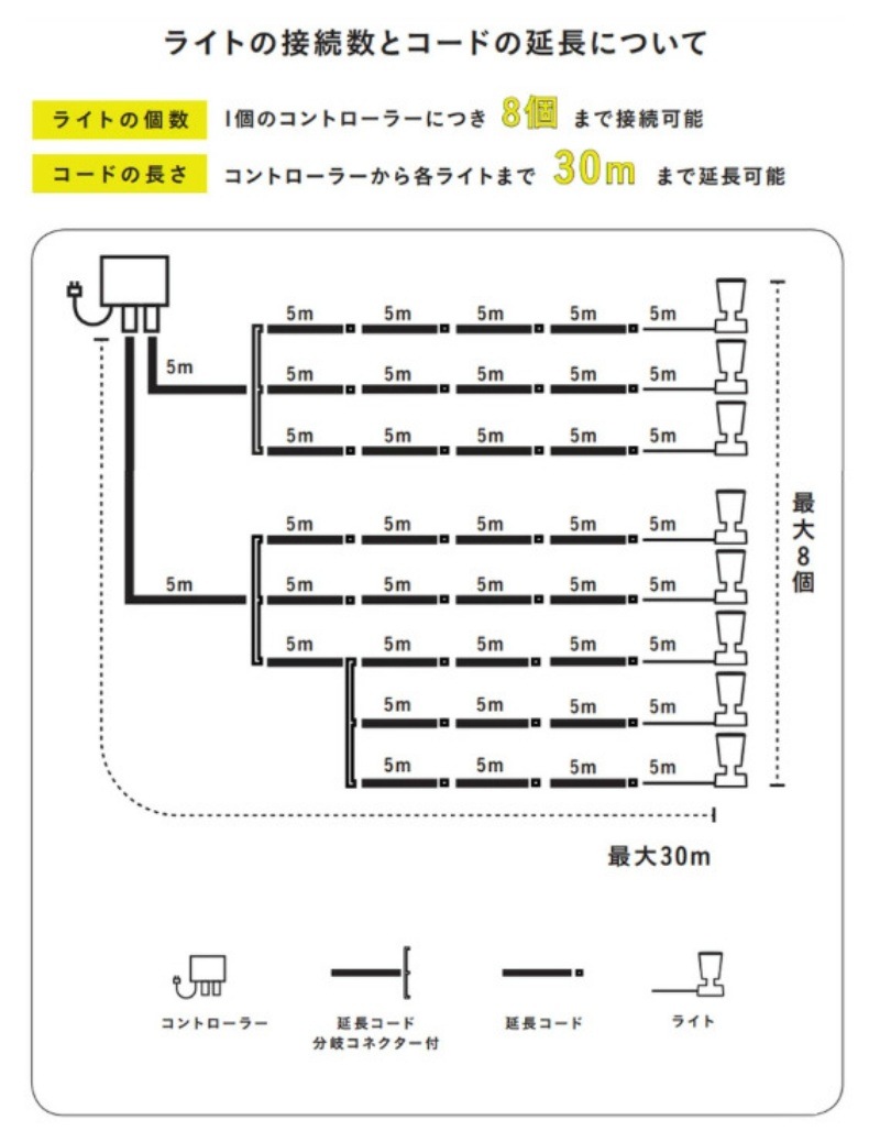 材質 : ライト本体:ASA樹脂、アクリル樹脂、ポリカーボネート、ABS樹脂、塩化ビニル樹脂、コントローラー:ポリカーボネート、電球:アルミニウム、分岐プラグ:塩化ビニル樹脂、延長コード:塩化ビニル樹脂