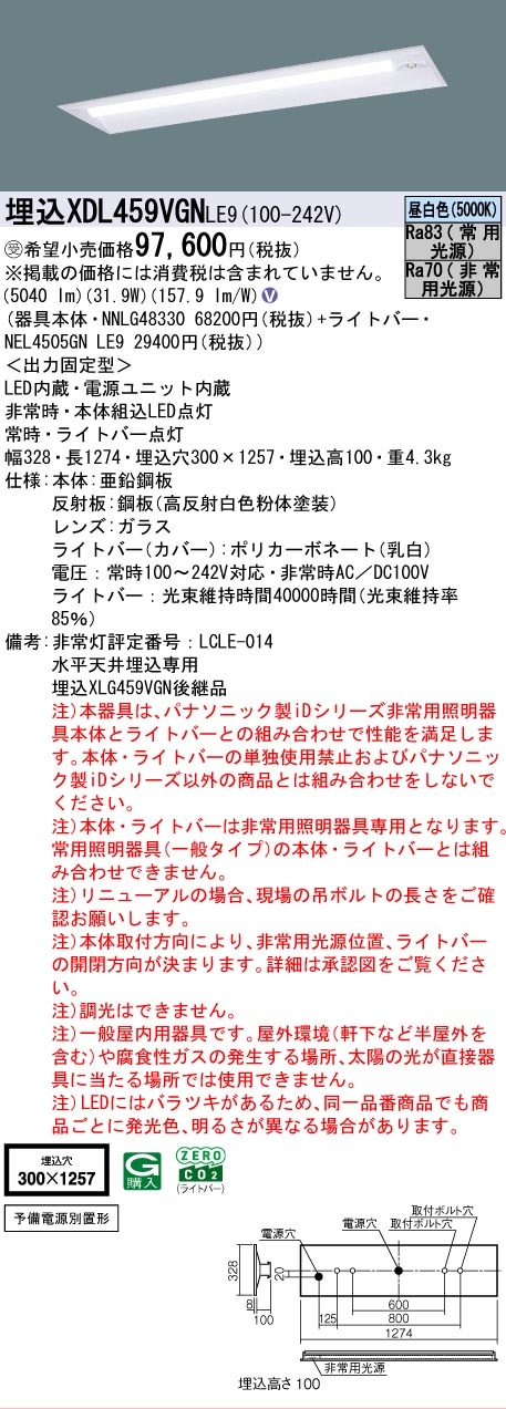 [法人限定][取寄品] XDL459VGN LE9 パナソニック ※受注品 リニューアル用 埋込型 40形 一体型LEDベースライト (非常用)【電源別置形・予備電源別置形】 [ XDL459VGNLE9 ]<注意>電源内蔵形ではありません!