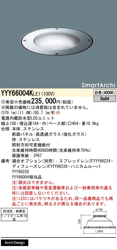 [法人限定][取寄品] YYY66004K LE1 パナソニック ※受注品 地中埋込型 LED 白色 アッパーライト 1/2ビーム角17度 防浸型・耐塵型 スマートアーキパネル付型 [ YYY66004KLE1 ]