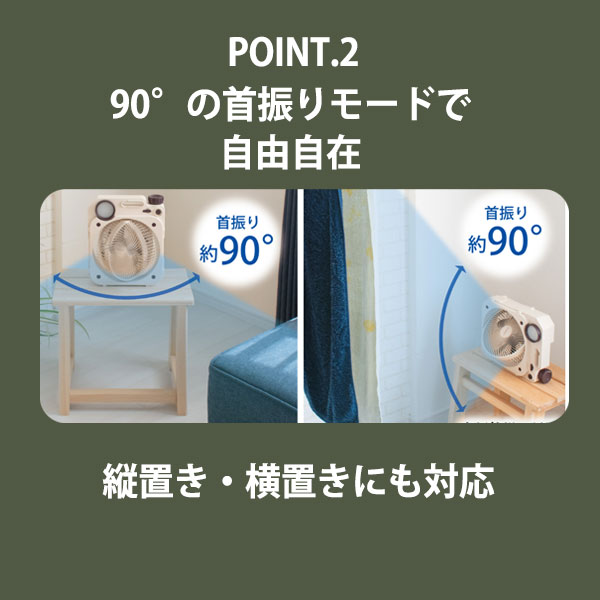 無段階の風量調整、DCモーターを搭載した静音設計、90°の自動首振りや縦置き・横置きにも対応。
