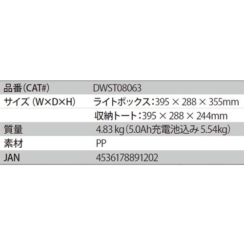 ○[法人限定][即納在庫有り] DWST08063-JP デウォルト DEWALT タフシステム2.0 18V LEDライトボックスセット(充電池・充電器付き) [ DWST08063JP ]