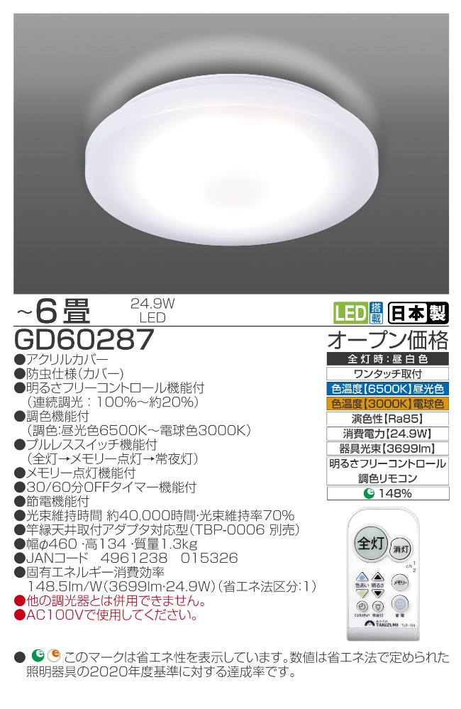 ○[即納在庫有り] GD60287 タキズミ 瀧住 TAKIZUMI LEDシーリングライト ~6畳用 調光 調色 [ GD60287 ]