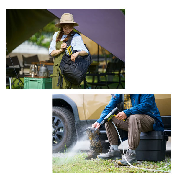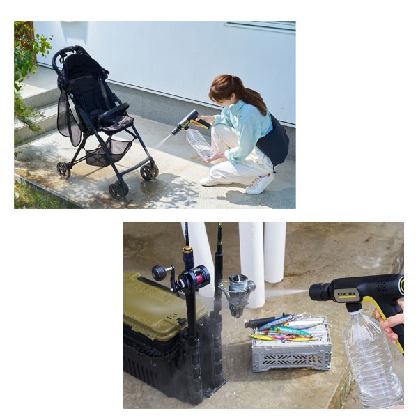 バッテリー内蔵式で、付属の自吸用ホースまたはペットボトルを使用することで、電源はもちろん水源も気にせずどこでも高圧洗浄できます。