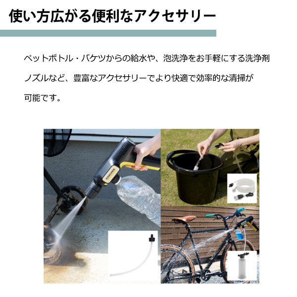 充電式バッテリーと自吸用ホース・ペットボトルアダプター付属で、どこでも持ち運んで洗浄可能です。