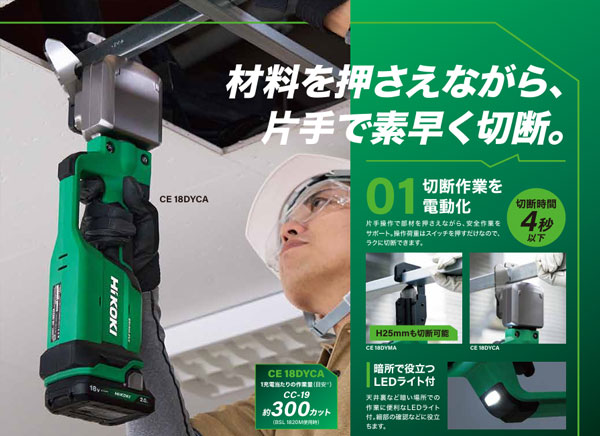片手操作で部材を押さえながら、安全作業をサポート。操作荷重はスイッチを押すだけなので、 ラクに切断できます。