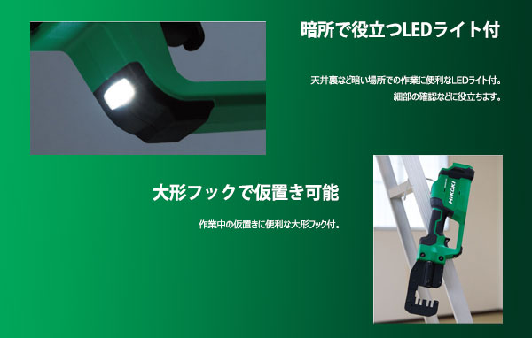 天井裏など暗い場所での作業に便利なLEDライト付。細部の確認などに役立ちます。