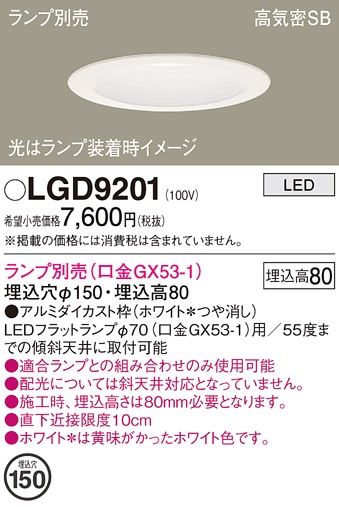 ○[法人限定][即納在庫有り] LGD9201 パナソニック ※ランプ別売 天井埋込型 LED ダウンライト 浅型8H 埋込穴φ155 [ LGD9201 ]
