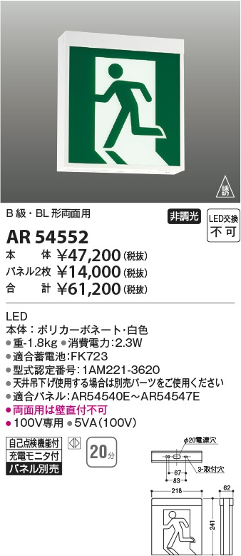 [法人限定][取寄品] AR54552 コイズミ KOIZUMI 誘導灯 LED交換不可 [ AR54552 ]